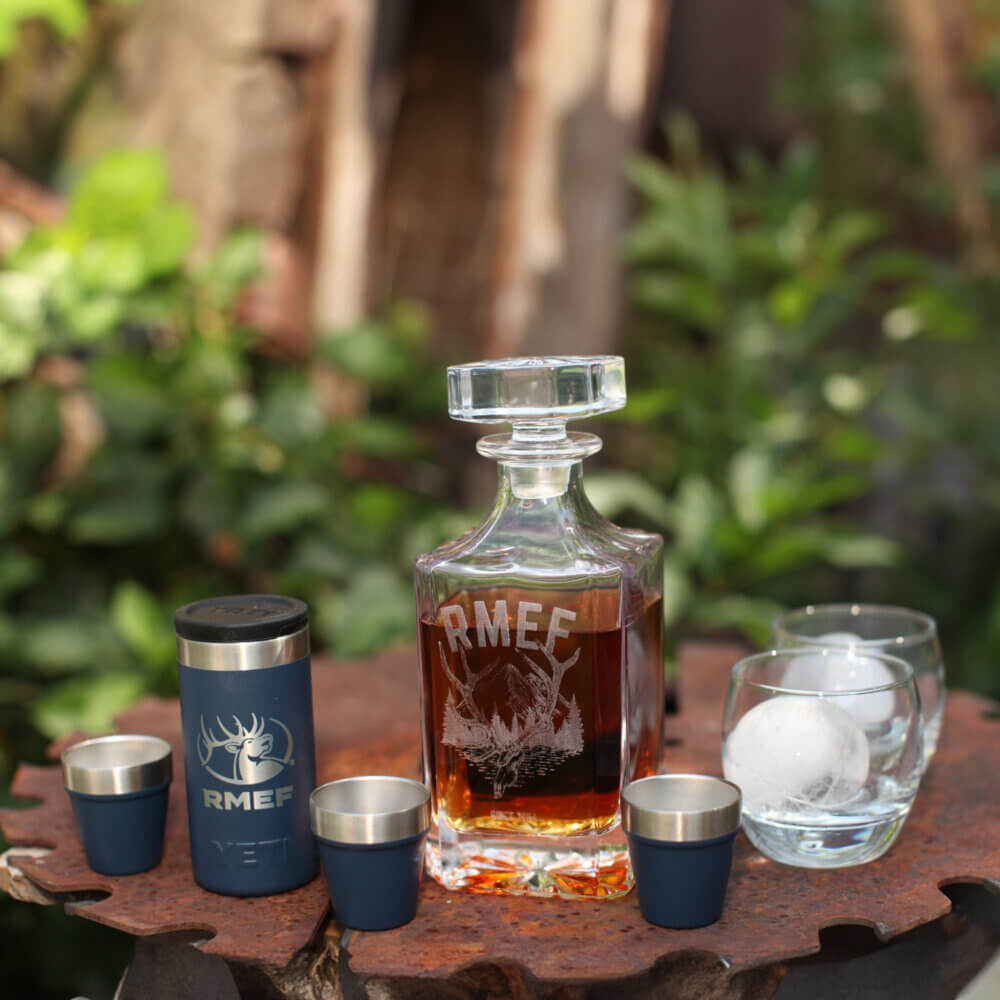 Elevate your home bar with this premium 750ml RMEF decanter, crafted from high-quality glass for exceptional clarity and durability. Featuring your choice of multiple RMEF logo designs, each finely etched for a refined finish, this decanter perfectly blends elegance and outdoor spirit. Ideal for displaying and serving your favorite whiskey, bourbon, or wine—an excellent gift for any Rocky Mountain Elk Foundation supporter or collector.