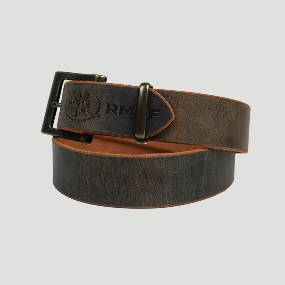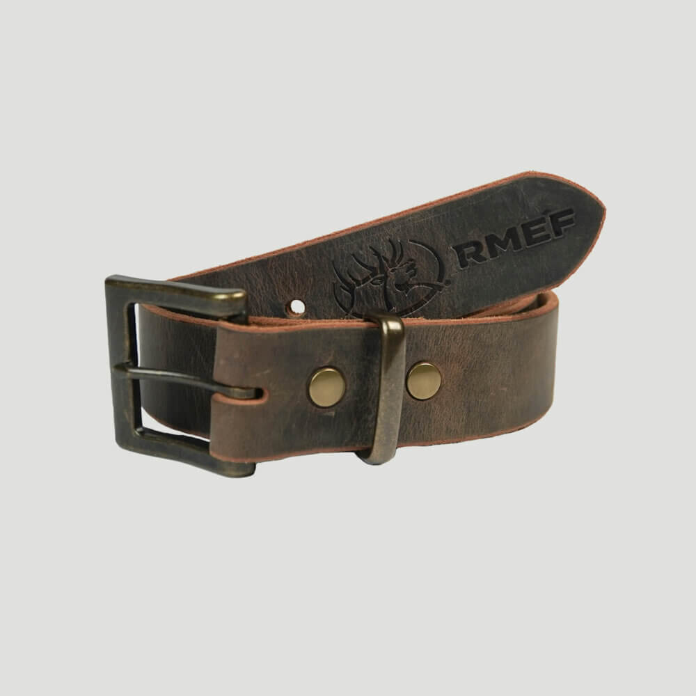 The perfect belt - built to last a lifetime. The RMEF Steerhide belt is made of premium leather by Francesca at Teton Leather Company. This belt is made in 10oz oil stuffed steerhide, featuring a full grain with a pullup finish and antique brass buckle. Meaning that this belt will only get better with time, forming a natural patina and breaking in very comfortably.