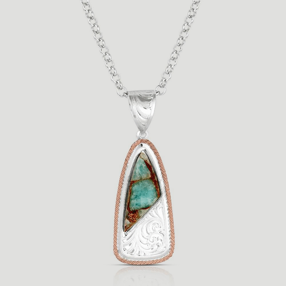 Bring a touch of the southwest to your look with the Shadowed Pines Turquoise Necklace. Made in the USA, it features a teardrop pendant in silver and rose gold tones, accented with compressed genuine turquoise for natural, unique beauty. The pendant hangs from a 16 inch Rolo chain with a 3 inch extender and secure lobster clasp, offering a polished, versatile design perfect for everyday wear or special occasions. Stone color may vary.